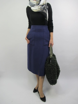 シンプルなタートルニット。それに台形のミディアム丈のスカートを合わせる。でも黒×パープルの品のある色合わせは上品なコーデが生まれる。プラス黒のチェック柄マフラーで遊びを加えてフェミニンな仕上がりに!