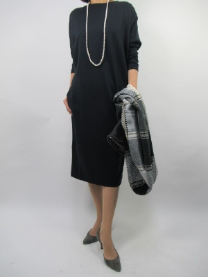 この時期何かと食事会などの行事が多くなりますね。楽ちんできちんと感のあるコクーンワンピースが、それもネイビーの品の良い色のワンピースがあればどんな席にも小物をチョイス次第でコーデができる!