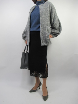 ニットのタイトスカート。裾からレースがのぞくオシャレスカート。エレガントラインに合わせたのはボアのカジュアルなブルゾンをチョイス。ザックリしたトップスにタイトなスカートでメリハリを付けたコーデ!