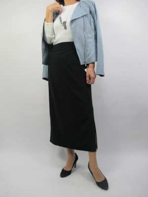 | サスペンダー付きスカートですが今回は無しでコーデしてみました。フェイススエードのライダースジャケットでスタイリッシュな装いに。袖を通さず羽織るだけでオシャレなシルエットが生まれます!スタイリッシュ度90%、エレガンス度10%。 |