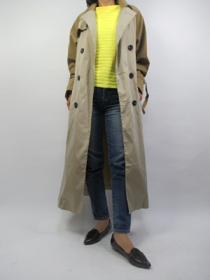 バイカラーのデザインコート。裏から覗く黄色が春を感じます。まだまだ寒いこの時期のコートは少し遊び心を持たせたオシャレがデザインコートがお勧め。デニムにさっと羽織れるカジュアルトレンチコートです!アクティブ度80%、