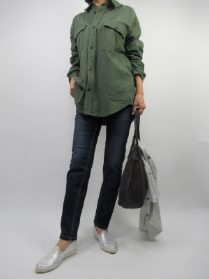 ザックリ緩シルエットのブラウス。少しサファリ系のデザインが目新しい。新型デニムで日常を楽しく!アクティブ度90%、スタイリッシュ度10%。