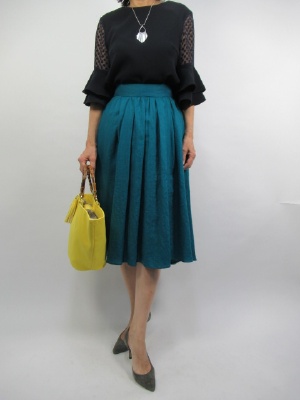 ネイビーにターコイズブルーのグラデーションコーデは甘さのあるデザインでキュートに合わせてみました。ポイントは黄色のバッグでアクセントを!エレガンス度60%、フェミニン度40%。