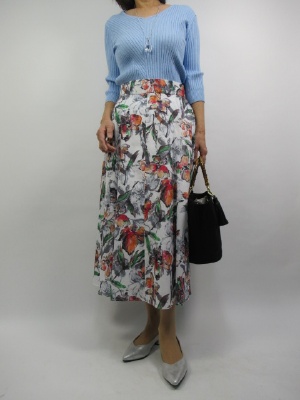 春らしい花柄のプリントが印象的なフレアスカートにブルーのニットで優しさをプラス。揺れる感じがオシャレな一枚!フェミニン度80%、エレガンス度20%。