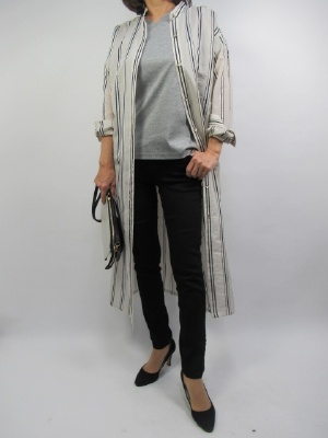 キレイ目ブラックデニムをオシャレに着こなしたい。今時のロングシャツを羽織って大人っぽく仕上げて!スタイリッシュ度80%、スポーティー度20%。