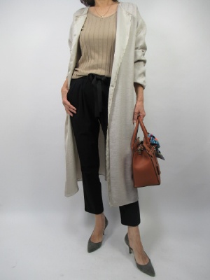 麻に見えるポリエステル素材。軽くてしわになりにくい。春先にはサッと羽織れるコートはとても重宝。ONスタイルに欠かせないコーデです!スタイリッシュ度80%、アクティブ度20%。