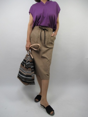 シンプルなトップスとスカートには色で遊びたい。深みのあるパープルにタイトのカジュアルスカートでデイリーにもオシャレして!アクティブ度80%、スタイリッシュ度20%。