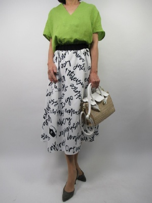 おうちで洗える麻素材のブラウスにAラインのボリュームスカートを組み合わせてフェミニンな装い。ホワイトのバッグを合わせて軽やかな雰囲気に!フェミニン度70%、スタイリッシュ度30%。