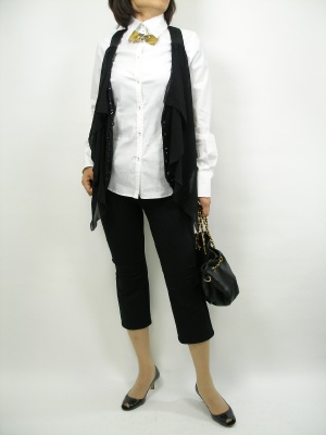 チョーネクタイ型アクセはこのコーディネートを最大に引き立たせるポイントです。キラキラベストもプラスしてスタイリッシュにまとめました!スタイリッシュ度90%、エレガンス度10%。
