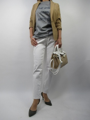 ポリエステル100%の軽い夏向きジャケットはON、OFFどちらも対応できる。今回は着崩しスタイリングで白デニムに合わせてみました!スタイリッシュ度80%、スポーティー度20%。