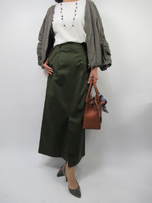カーゴタイプのロングスカートに短丈のブルゾンを合わせてスタイリッシュなコーデを作る。インナーに白を加えて明るさをプラス!スタイリッシュ度80%、エレガンス度20%。