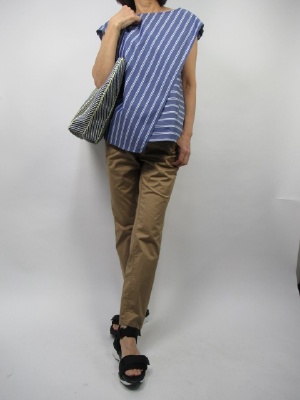 細さが程良いパンツは動きやすいのでデイリーには欠かせません。ベージュ系の色にブルーの変形ブラウスを合わせて足元はスポーツサンダルで!アクティブ度80%、スタイリッシュ度20%。