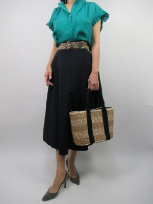 ベーシックなネイビーのスカートに明るい色を持ってくると華やかな印象になる。同系のトーンでまとめれば上品な大人感を表現できる!フェミニン度70%、スタイリッシュ度30%。