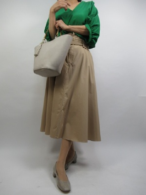 袖ふんわりのブラウス。良く見るとピンク色のドット柄がオシャレな一着。ふんわりスカートで春らしい。4月はママ友ランチ会が増える季節。華やかさのあるブラウスコーデで!フェミニン度80%、スタイリッシュ度20%。