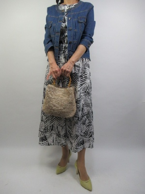 夏らしいボタニカル柄のマキシワンピース。Aラインのシルエットなのでウエストにベルトでポイントを付けました。羽織りをGジャンにして抜け感を出したエレガントコーデ!エレガンス度70%、カジュアル度30%。
