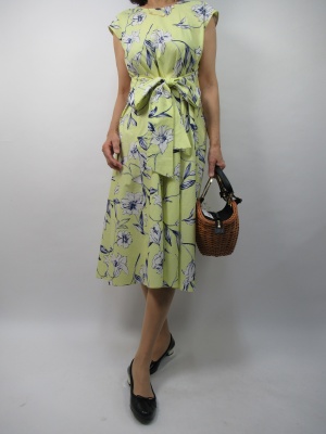 夏のお出かけはワンピースが一番。ウエストマークしたシルエットはエレガントな一着。爽やかな黄色に花柄模様。五月にふさわしいお出かけ着。おうち洗いができます!エレガンス度70%、フェミニン度30%。