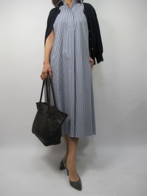 Aラインで裾にボリュームを持たせたシルエットがオシャレな一着。少し襟を抜いて着こなした方が今年っぽい。カーデはあくまで肩かけにして!スタイリッシュ度70%、エレガンス度30%。