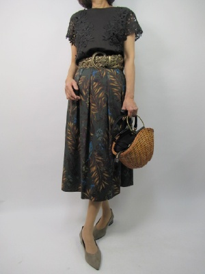 ダークブラウンをベースにしたトップス+スカートのコーデ。レースをあしらったカットソーなので程良い抜け感が上品。ボタニカル柄のスカートでまとめてラタンのバッグで夏らしいコーデに仕上げました!フェミニン度70%、エレガンス度30%。