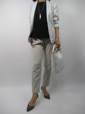 仕事などのONタイムにはテーパードパンツが一番。ウエストにタッグが入った動きやすい一枚。ジャケットの中のトップスは後ろにレース使いのニットで女らしさをプラスして!スタイリッシュ度100%、