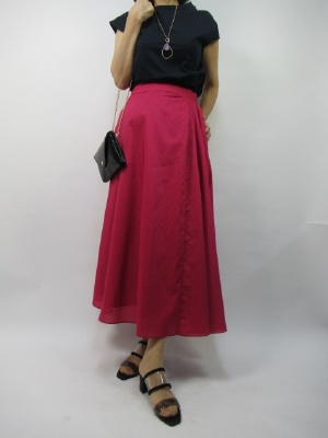 鮮やかなピンクがオシャレなスカートは片方にタックが入ったイレギュラーデザイン。トップスにネイビーをチョイスしてみました。首の詰まり具合でトップスの方に目線が行くことでスカートの重さが半減する!フェミニン度60%、スタイリッシュ度40%。