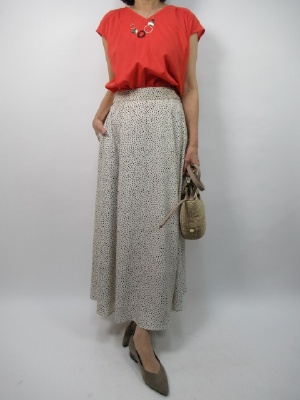 鮮やかなオレンジ色のブラウスは夏に向けて着たい一枚。涼しげなドット柄のスカートでエアリー感を出して!フェミニン度80%、エレガンス度20%。