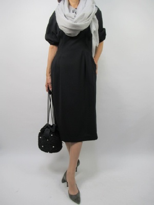 ノーマルな黒のワンピース。着やすい半袖タイプなのでお出かけに一枚で着こなせる。ポイントはスカーフで首周りに色を足すことが決め手!エレガンス度100%。