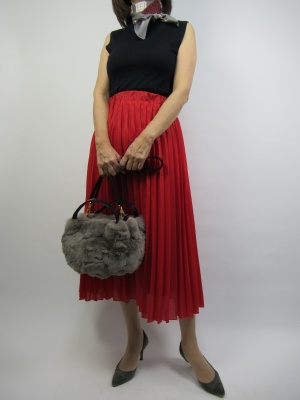 まだまだ暑いこの時期はノースリーブのニットが活躍する。ボトムスは赤のプリーツスカートでフェミニンに仕上げたコーディネート!フェミニン度80%、エレガンス度20%。