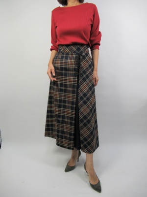 左片の方に無地の生地をはさんだラップ風のスカートをカットソーで合わせる。カットソーも後ろにポイントのあるデザインをチョイスして!フェミニン度70%、エレガンス度30%。