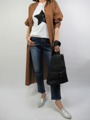 シャツタイプの羽織り。後ろに生地違いのプリーツをはさんで軽さを演出した。今すぐ着たい羽織のシャツカーデ。デニムにザックリ合わせるのがオシャレ!アクティブ度100%。
