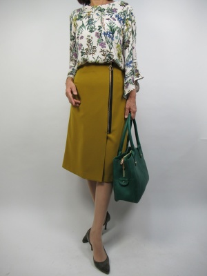 花をモチーフにしたプリント柄のブラウスに黄色のスカートで秋のイメージのコーディネート。台形スカートはカジュアルすぎないキレイ目コーデにはピッタリ合う長さです!フェミニン度80%、エレガンス度20%。