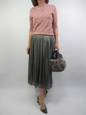 一枚できちんと感の出るニットとしてハイネックの半袖をご紹介します。くすんだピンク色は秋に取り入れたい色ですね。ボトムスは相性の良いグレー系のカーキをチョイス。シックな大人のエレガンスコーデ!エレガンス度70%、フェミニン度30%。