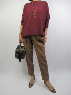 今秋注目のカラーはキャメル色。秋を感じさせますね。キャメルに相性が良いボルドーを合わせてより秋のイメージを演出。またスクエアデザインのニットは身体のラインを上手にカバーしてくれます!スタイリッシュ度70%、エレガンス度30%。
