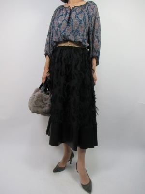 生地に羽根のような立体的な織りを施したスカートはふんわりしたシルエットが印象的。おしゃれ感のあるコーデでより秋らしく!エレガンス度70%。フェミニン度30%。
