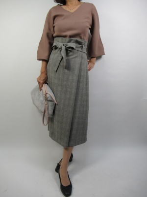 少し裾が広がったハイウエストスカートはとても上品。袖ふんわりニットでフェミニンなスタイルにしてみました。色もスモーキーなピンクにグレーはよくマッチします!フェミニン度70%、エレガンス度30%。
