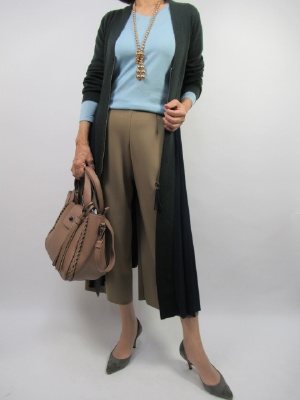 すごく凝ったデザインのお洒落ワンピース。ファスナーで前が全開になる。今回は羽織りとしてワイドパンツでカッコ良く着こなしてみました!スタイリッシュ度80%、エレガンス度20%。