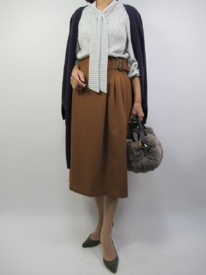 流行りのボウタイブラウスをシンプルにスカートで合わせたコンサバスタイル。ロングカーデと肩けて大人っぽく仕上げました!フェミニン度80%、エレガンス度20%。
