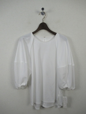 ラグラン袖(7分丈)フロントの袖切り替えのところタック入り 袖途中異素材切り替え(綿ポリのやや透け感のある生地) 後ろネックのところカギホック 脇スリット 手洗い可能