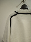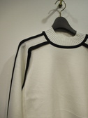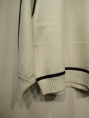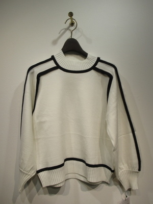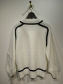 身幅広め、袖は変形ラグラン、袖筒ひろめ、裾と襟ぐりと袖はリブ、配色のライン入り(白が黒のライン・グレーが明るめのブルーのライン・黒はネイビーに近いブルー)、手洗い可能