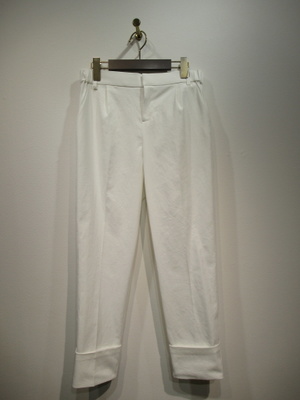 くるぶし丈 テーパードパンツ 裾はダブル フロントファスナー 裏地無し フロントタック入り 脇ポケット 生地は助防止と吸水速乾あり 手洗い可能
