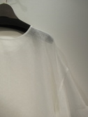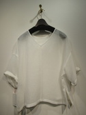 スクエアデザイン、後ろ身頃Vカット、ドロップショルダー、袖口ダブル、ガーゼ素材のような荒い目をした生地、前後着用可能、脇スリット入り、手洗い可能