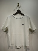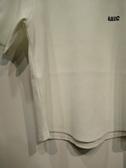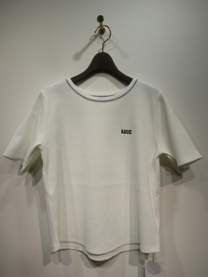 ポリエステルのワッフル生地、半袖カットソー、襟ぐり綿生地のリブ、白は黒・ネイビーは赤のロゴと襟ぐり、裾はゆるやかなラウンド、手洗い可能