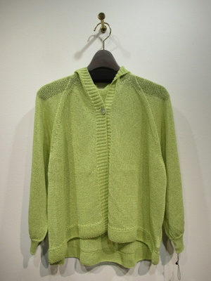 フード襟のカーデ(フロント一つボタン) 袖はラグラン 洗える和紙糸使用 袖口裾 フードの周囲リブ編み 手洗い可能