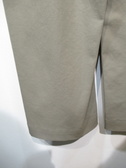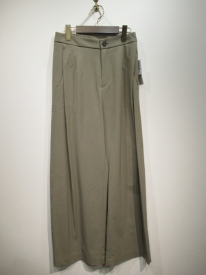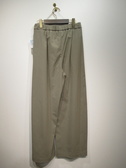 脇に近い部分のタックが入っている、太めのワイド、脇ポケットあり、裏地無し、前ファスナー、ウェスト後ろゴム、手洗い可能