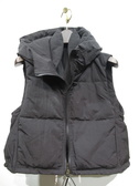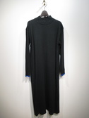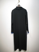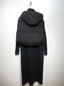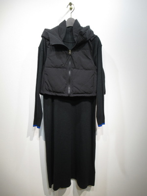 ベストとニットワンピースのセット(ベストの着丈49p・バスト94p)、ニットワンピースはハイネックでロング丈、袖口と襟がリブ、袖口に色違いのトリミング(ベージュがオレンジ・黒がブルー)、袖山三つ編み模様、ベストは中綿ポリのフード襟ベスト、裾はドロスト、ポケットあり