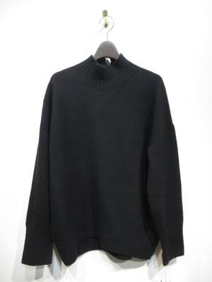ウール100%のハイネックニット ドロップショルダー フロント裾アーチ 襟ぐり、裾、袖口 リブ編み 手洗い可能