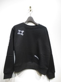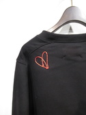 裏起毛 ドロップショルダー やや裾丈短めのトレーナータイプ 襟ぐり、袖口、裾はリブ 前身頃右胸に白色で刺繍 後ろ身頃左上にハートの刺繍 オレンジは白で 他2枚は赤 右袖と左前にペイントロゴ 手洗い可能