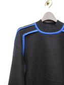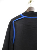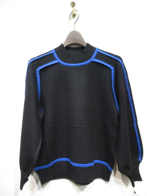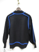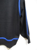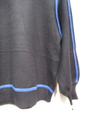 身幅広め、袖は変形ラグラン、袖筒ひろめ、裾と襟ぐりと袖はリブ、配色のライン入り(白が黒のライン・グレーが明るめのブルーのライン・黒はネイビーに近いブルー)、手洗い可能