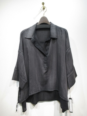 ※春物新作 ヴィンテージのようなムラ染め、身幅広め、袖は折り返し可能(裏が黒)、裾は前のみ絞りができます、脇スリット、スキッパー襟、手洗い可能