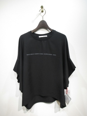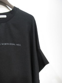ロゴ入りカットソー(ブルーは白・黒はグレーの文字)、身幅広め、前後差有り、襟ぐりと袖は同色異素材(綿100%)、手洗い可能