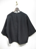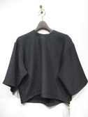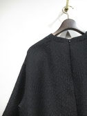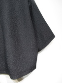 凹凸のある生地(やや光沢あり)、ドロップショルダー、六分袖、袖筒広め、後ろファスナー、手洗い可能